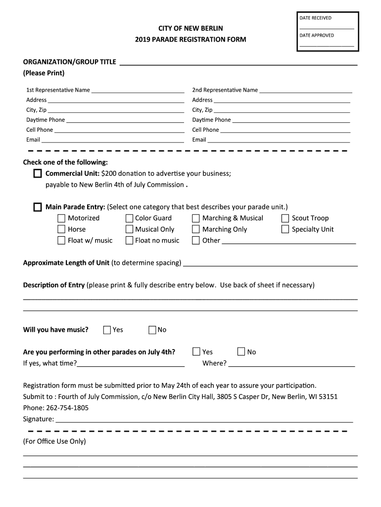 DATE RECEIVEDCITY OF NEW BERLIN 2019 PARADE REGISTRATION FORM DATE APPROVED ORGANIZATION/GROUP TITLE (Please Print) 1st Representative Name 2nd Representative Name Address City, Zip City, Zip Daytime