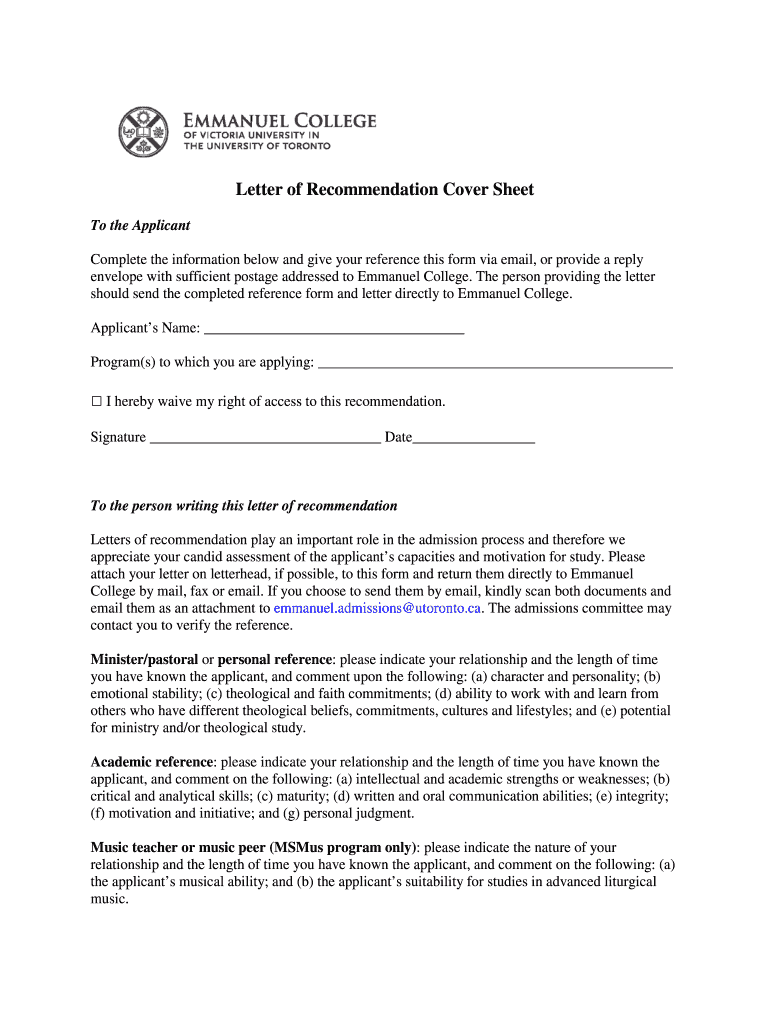 Letter of Recommendation Cover Sheet To the Applicant Complete the information below and give your reference this form via email, or provide a reply envelope with sufficient postage addressed to Emmanuel