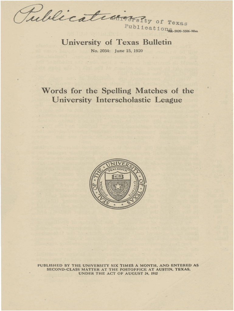 Sty of Te:x:a.; Pub 11 ca t 1 o li582oSS06somUniversity of Texas Bulletin No. 2034: June 15, 1920Words for the Spelling Matches of the University Interscholastic LeaguePUBLISHED BY THE UNIVERSITY