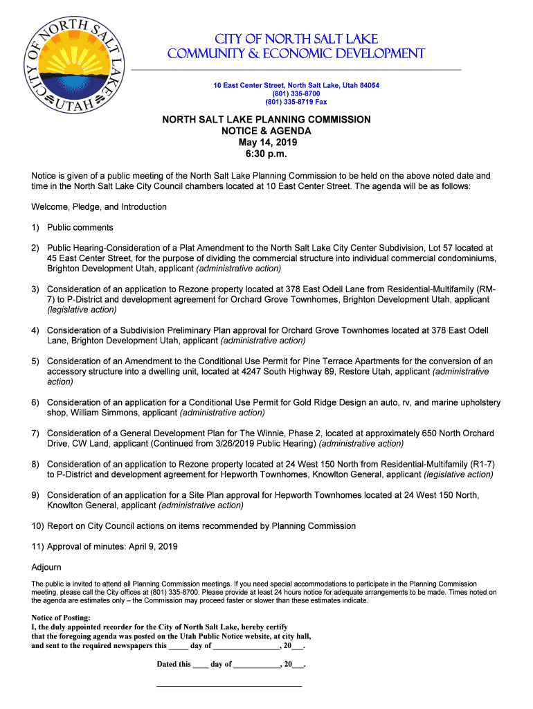 CITY OF NORTH SALT LAKE COMMUNITY & ECONOMIC DEVELOPMENT 10 East Center Street, North Salt Lake, Utah 84054 (801) 3358700 (801) 3358719 North SALT LAKE PLANNING COMMISSION NOTICE & AGENDA May 14,