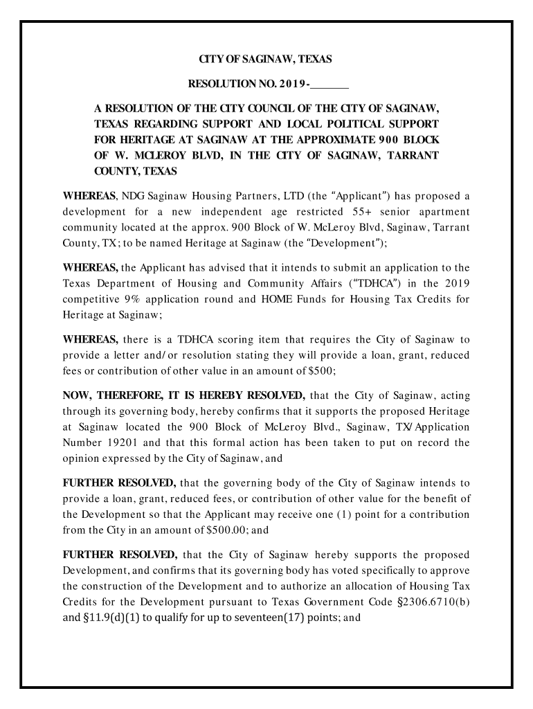 CITY OF SAGINAW, TEXAS RESOLUTION NO. 2019 A RESOLUTION OF THE CITY COUNCIL OF THE CITY OF SAGINAW, TEXAS REGARDING SUPPORT AND LOCAL POLITICAL SUPPORT FOR HERITAGE AT SAGINAW AT THE APPROXIMATE 900