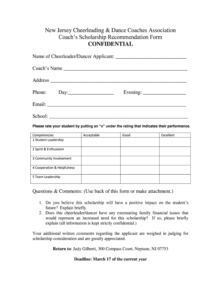 New Jersey Cheerleading & Dance Coaches Association Coach Scholarship Recommendation Form CONFIDENTIAL Name of Cheerleader/Dancer Applicant: Coach Name Address Phone:Day: Evening: Email: School: Please
