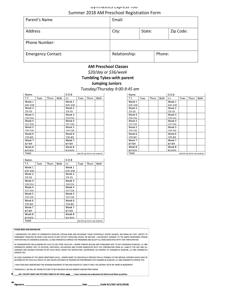 GymnasticsExpressTooSummer2018AMPreschoolRegistrationForm