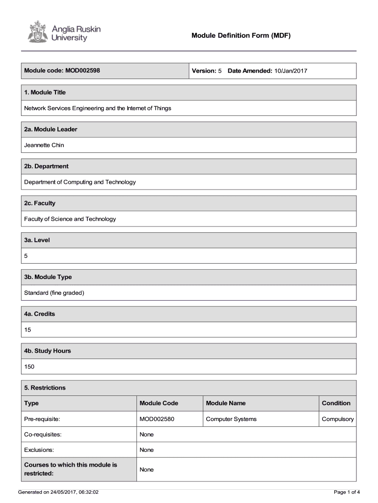 Module Definition Form (MDF)Module code: MOD002598Version: 5 Date Amended: 10/Jan/20171. Module Title