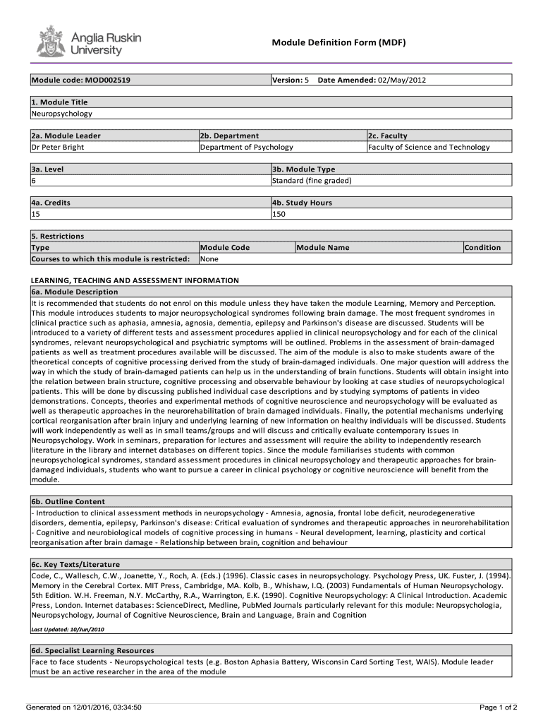 Module code: MOD002519Version: 5 Date Amended: 02/May/20121. Module Title