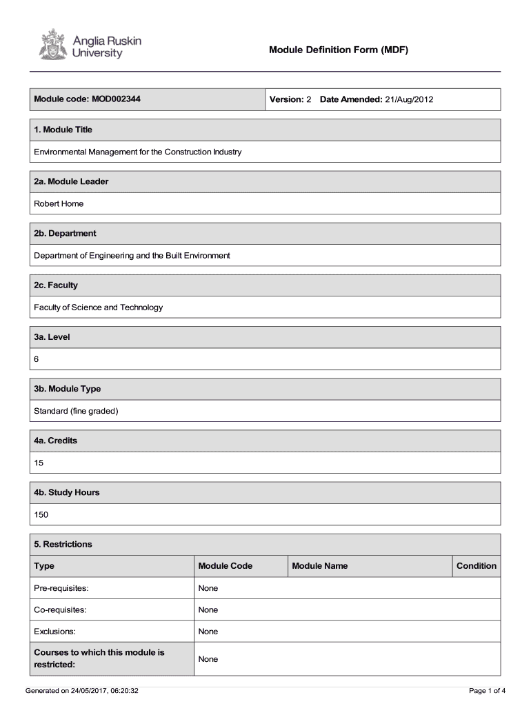 Module Definition Form (MDF)Module code: MOD002344Version: 2 Date Amended: 21/Aug/20121. Module Title