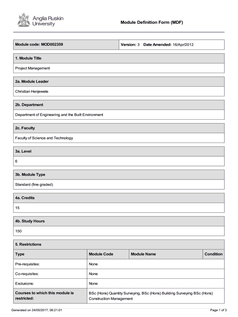 Module Definition Form (MDF)Module code: MOD002359Version: 3 Date Amended: 16/Apr/20121. Module Title