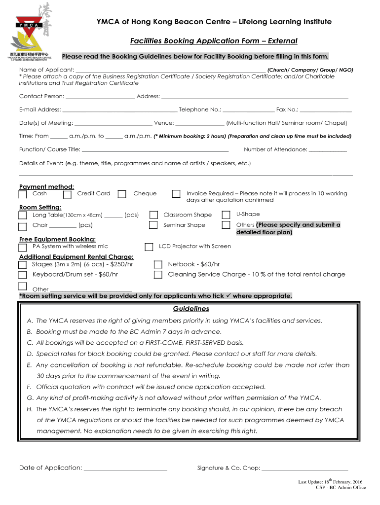 YMCA of Hong Kong Beacon Center Lifelong Learning Institute Facilities Booking Application Form External Please read the Booking Guidelines below for Facility Booking before filling in this form.
