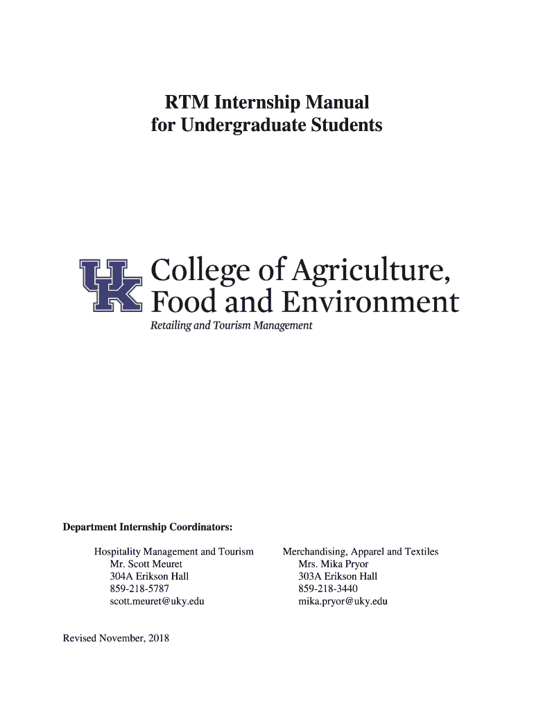 RTM Internship Manual for Undergraduate StudentsDepartment Internship Coordinators: Hospitality Management and Tourism Mr. Scott Meet 304A Erikson Hall 8592185787 Scott. Meet UK.revised November,