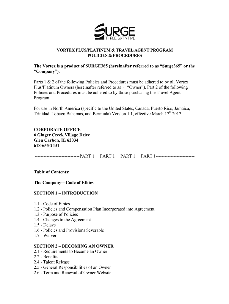 VORTEX PLUS/PLATINUM & TRAVEL AGENT PROGRAM POLICIES & PROCEDURES The Vortex is a product of SURGE365 (hereinafter referred to as Surge365 or the Company). Parts 1 & 2 of the following Policies and