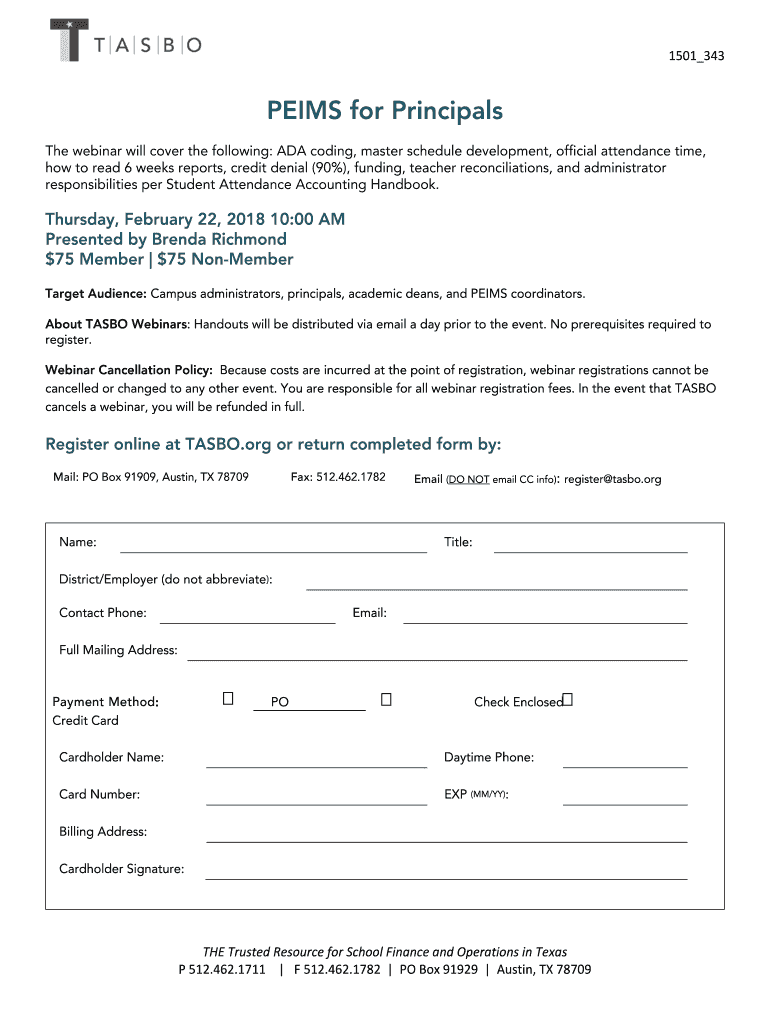 1501 343PEIMS for Principals The webinar will cover the following: ADA coding, master schedule development, official attendance time, how to read 6 weeks reports, credit denial (90%), funding, teacher