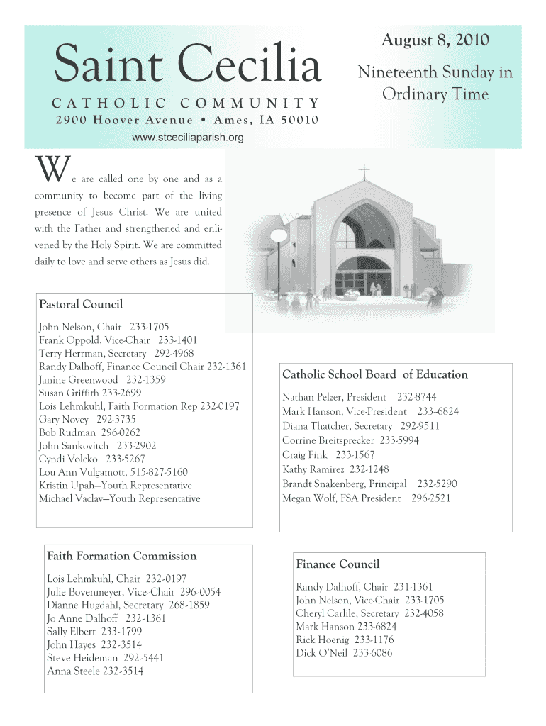 Saint Cecilia CAT H O L I CC O M M U N I TY August 8, 2010, Nineteenth Sunday in Ordinary Time2 9 0 0 H o o v e r Av e n u e A m e s, I Am 5 0 010 www.stceciliaparish.orgWe are called one by one and