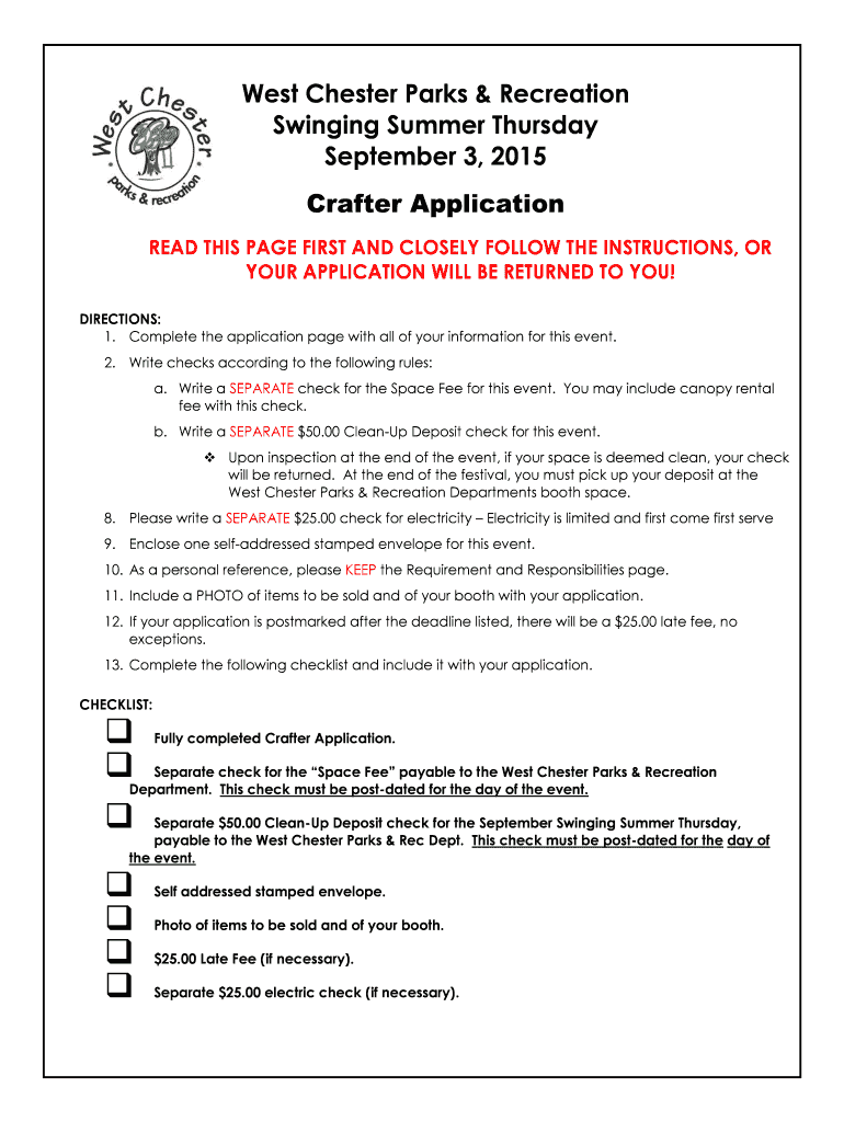 West Chester Parks & Recreation Swinging Summer Thursday, September 3, 2015, Crater Application READ THIS PAGE FIRST AND CLOSELY FOLLOW THE INSTRUCTIONS, OR YOUR APPLICATION WILL BE RETURNED TO YOU!