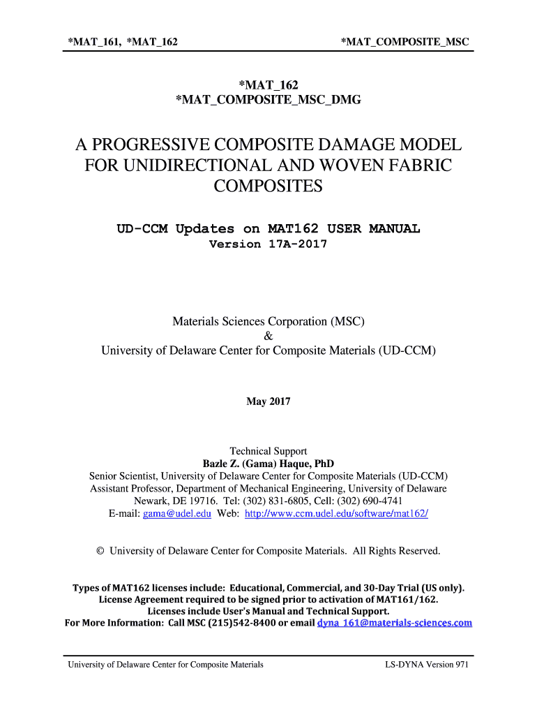 *MAT 161, *MAT 162×MAT COMPOSITE MSC×MAT 162 *MAT COMPOSITE MSC DMCA PROGRESSIVE COMPOSITE DAMAGE MODEL FOR UNIDIRECTIONAL AND WOVEN FABRIC COMPOSITES UDC CM Updates on MAT162 USER MANUAL Version