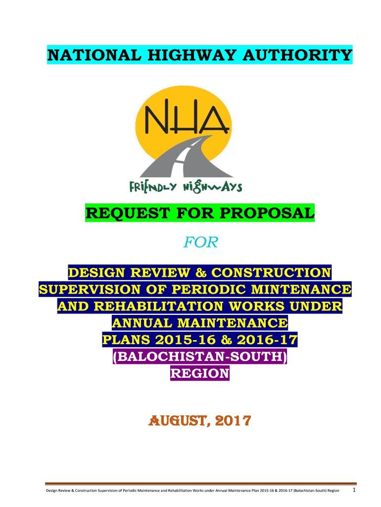 NATIONAL HIGHWAY AUTHORITYREQUEST FOR PROPOSAL FOR DESIGN REVIEW & CONSTRUCTION SUPERVISION OF PERIODIC MAINTENANCE AND REHABILITATION WORKS UNDER ANNUAL MAINTENANCE PLANS 201516 & 201617 (BALOCHISTANSOUTH)