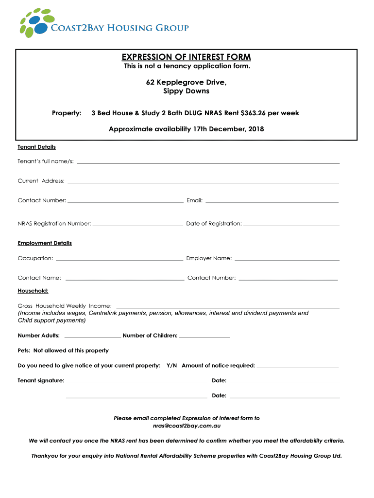 EXPRESSION OF INTEREST FORM This is not a tenancy application form.62 Kepplegrove Drive, Hippy Downs Property:3-Bed House & Study 2 Bath DRUG ERAS Rent $363.26 per week Approximate availability 17th