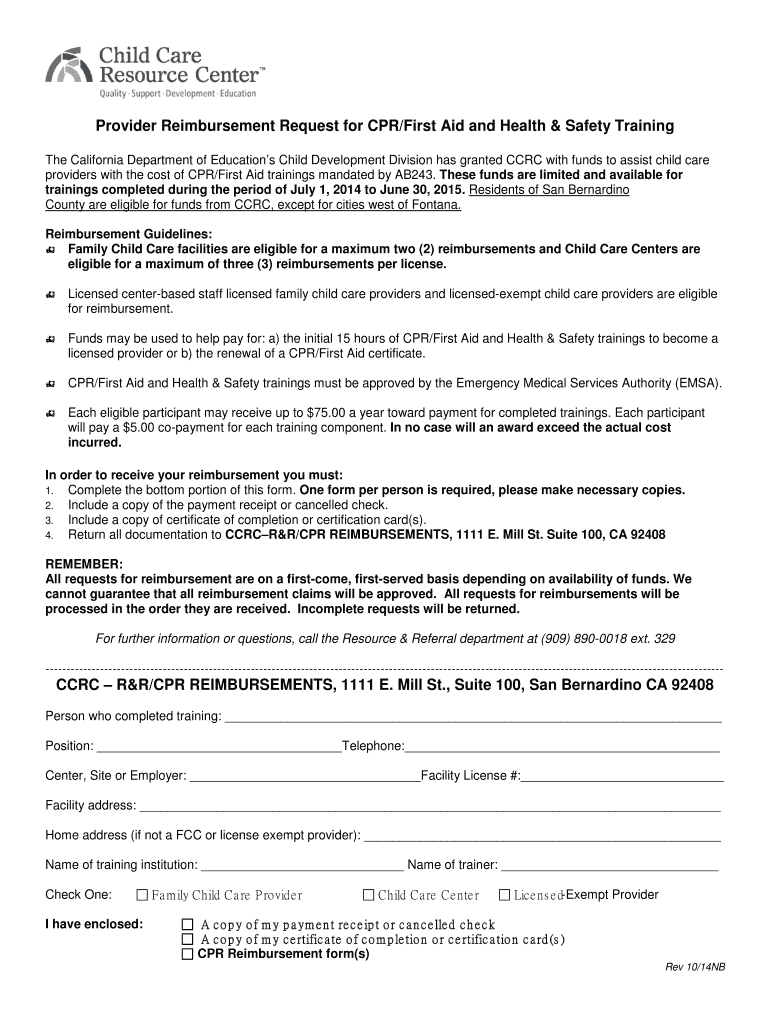 Provider Reimbursement Request for CPR/First Aid and Health & Safety Training The California Department of Educations Child Development Division has granted CCC with funds to assist child care providers