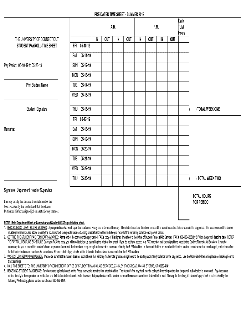 PREDATED TIME SHEET SUMMER 2019 A.M. THE UNIVERSITY OF CONNECTICUT STUDENT PAYROLL TIME SHEETING FRI051019SAT051119Pay Period: 051019 to 052319SUN051219 MON 051319Print Student Name Student SignatureRemarks:TUEOUTDaily