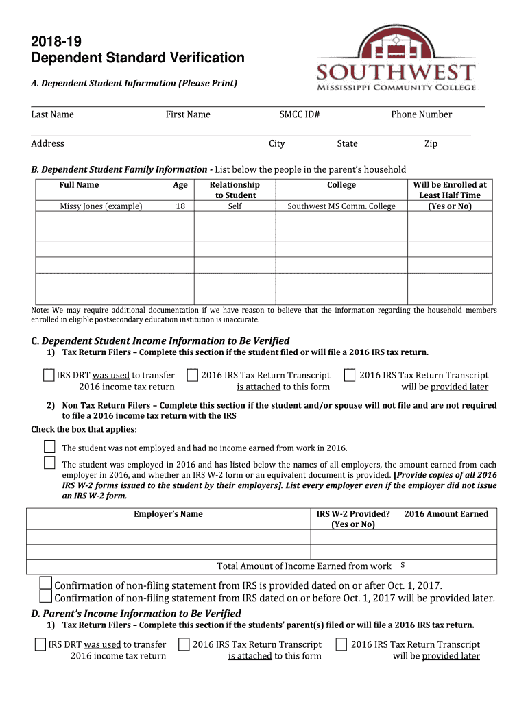 201819 Dependent Standard Verification A. Dependent Student Information (Please Print) Last Name First Name SCC ID# Phone Number Address City State Zip B. Dependent Student Family Information List