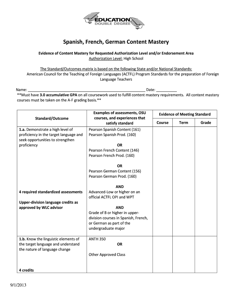 Get the free Spanish, French, German Content Mastery - College of ... - education oregonstate