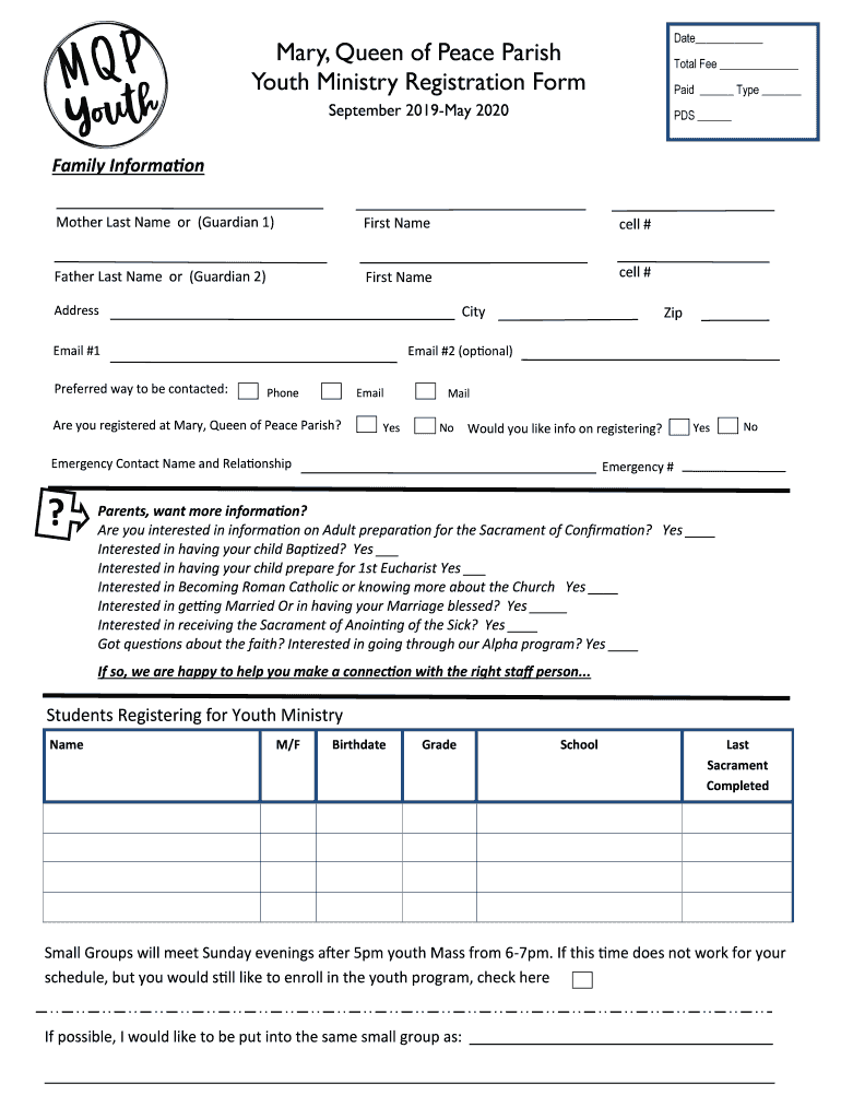 Date Mary, Queen of Peace Parish Youth Ministry Registration Formal Fee Paid Type September 2019May 2020PDS Family Information Mother Last Name or (Guardian 1)First Name cell #Father Last Name or