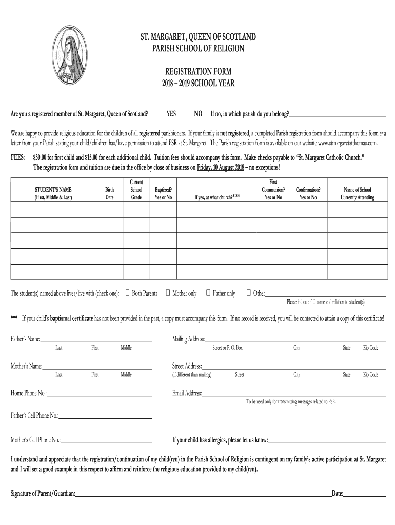 ST. MARGARET, QUEEN OF SCOTLAND PARISH SCHOOL OF RELIGION REGISTRATION FORM 2018 2019 SCHOOL YEAR Are you a registered member of St. Margaret, Queen of Scotland? YES Coif no, in which parish do you