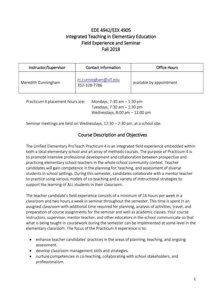 EDGE 4942/EX 4905 Integrated Teaching in Elementary Education Field Experience and Seminar Fall 2018Instructor/Supervisor Meredith CunninghamContact InformationOffice Hours. Cunningham NFL.edu 3523287786available