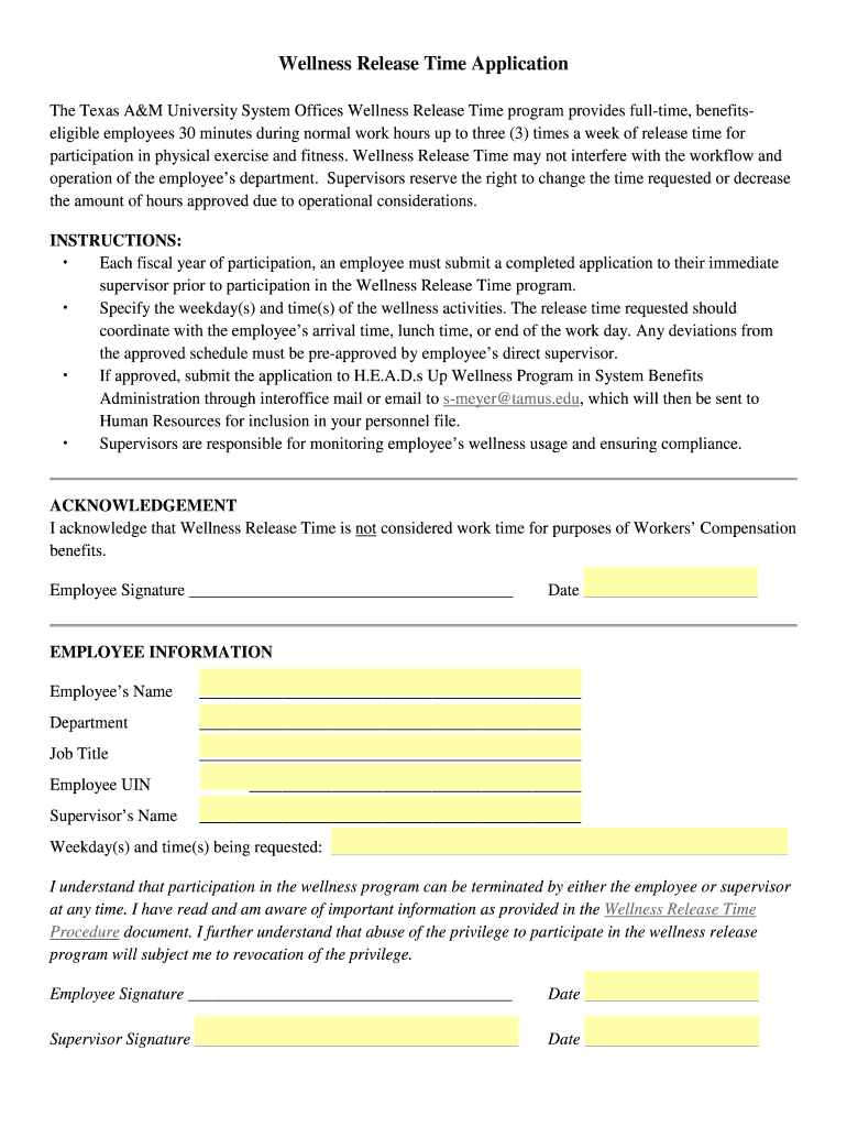 Wellness Release Time Application The Texas A&M University System Offices Wellness Release Time program provides full time, benefits eligible employees 30 minutes during normal work hours up to three