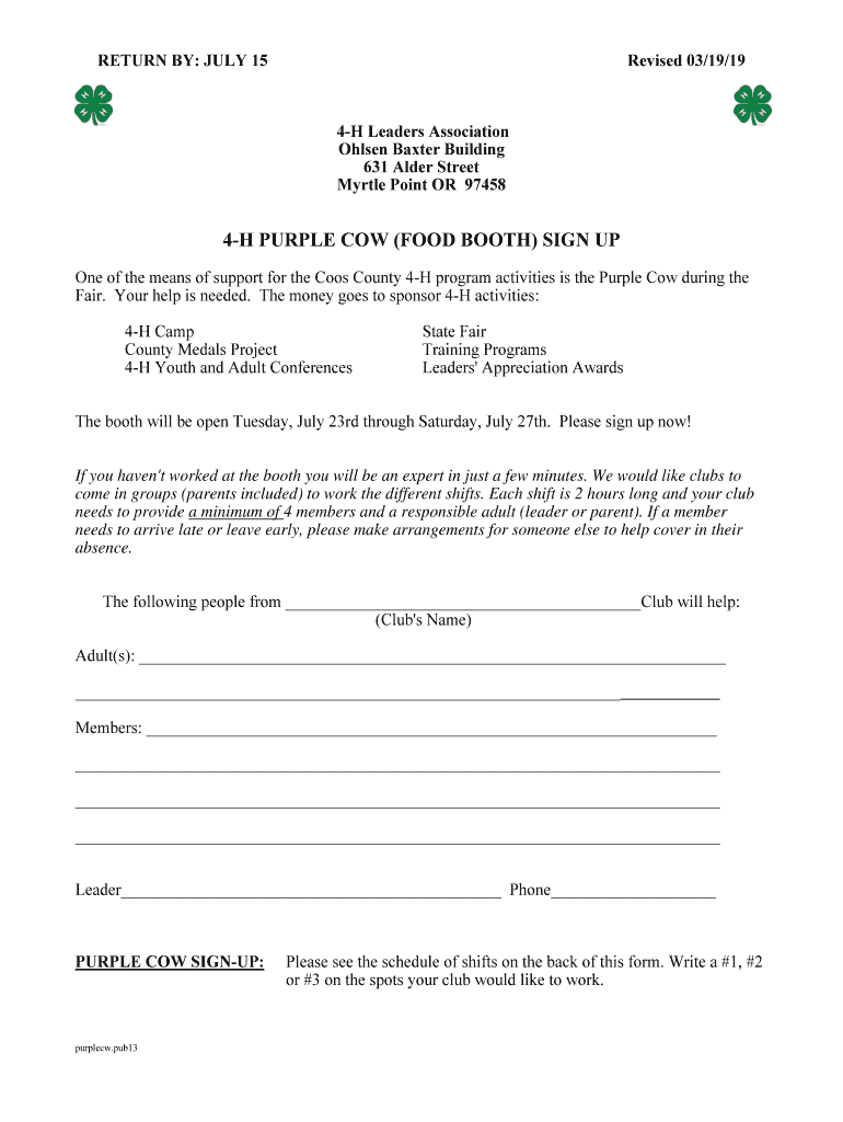 Get the free 4-H PURPLE COW (FOOD BOOTH) SIGN UP - extension oregonstate