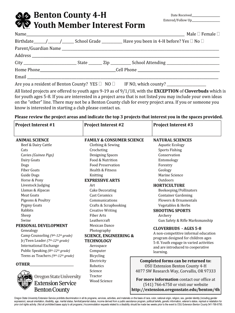 Benton County 4H Youth Member Interest Form Name Date Received Entered/Follow Up Male Female Birthdate / / School Grade Have you been in 4H before? Yes No Parent/Guardian Name Address City State Zip
