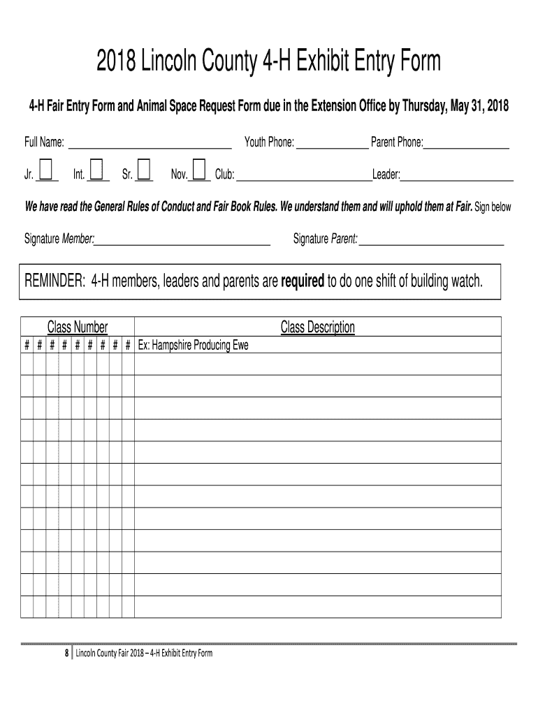 2018 Lincoln County 4H Exhibit Entry Form 4H Fair Entry Form and Animal Space Request Form due in the Extension Office by Thursday, May 31, 2018, Full Name: Jr. Int. Sr. Youth Phone: Parent Phone: