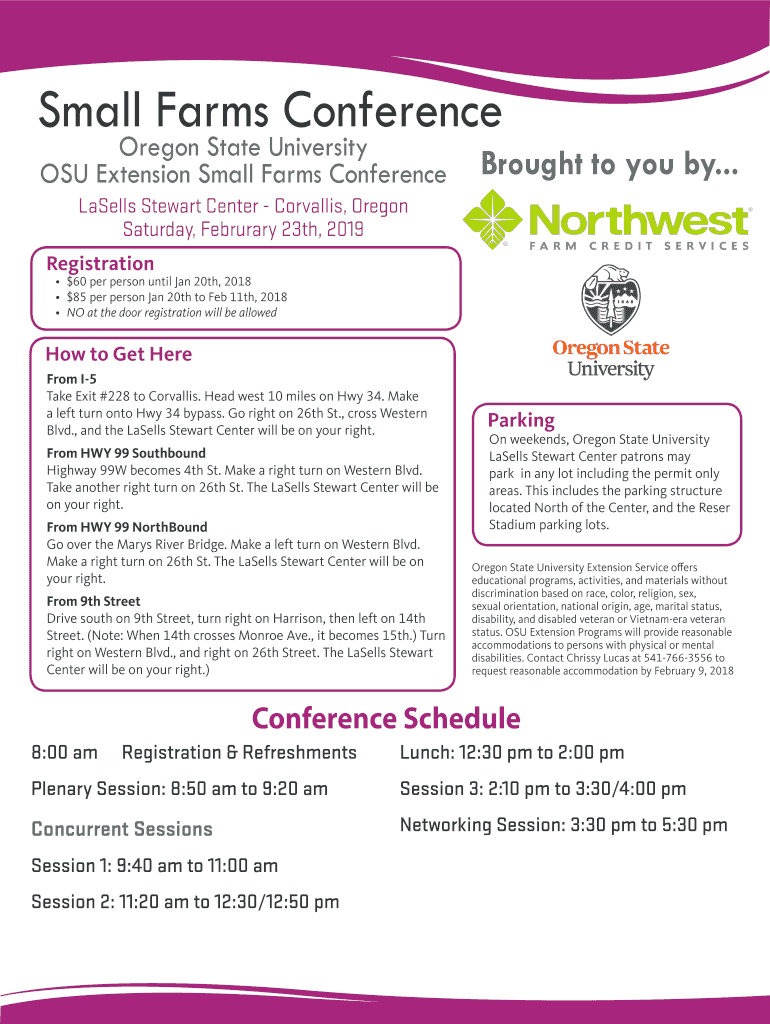 Oregon State University OSU Extension Small Farms ConferenceBrought to you by... Labels Stewart Center Corvallis, Oregon Saturday, February 23rd, 2019 Registration $60 per person until Jan 20th, 2018
