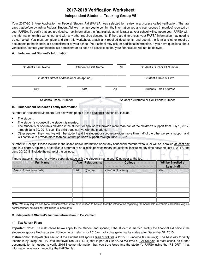 20172018 Verification Worksheet Independent Student Tracking Groups V5 Your 20172018 Free Application for Federal Student Aid (FAFSA) was selected for review in a process called verification. The