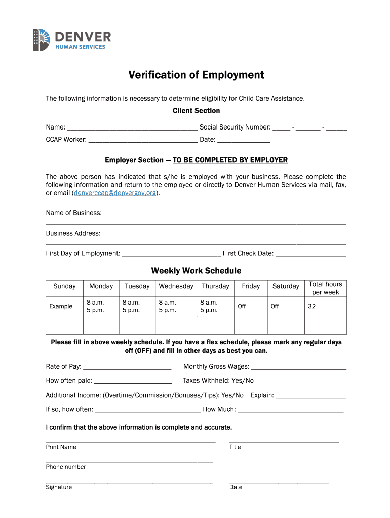 Verification of Employment The following information is necessary to determine eligibility for Child Care Assistance. Client Section Name: Social Security Number: CCAP Worker: Date: Employer Section