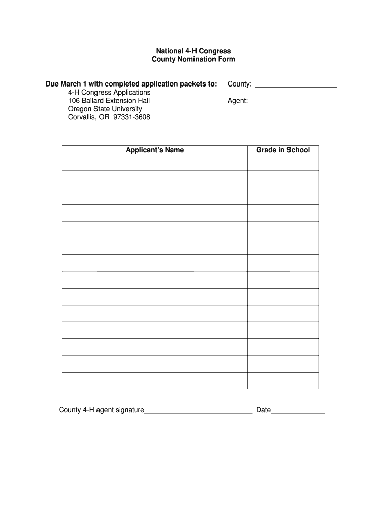 Get the free National 4-H Congress County Nomination Form Due March 1 ... - extension oregonstate