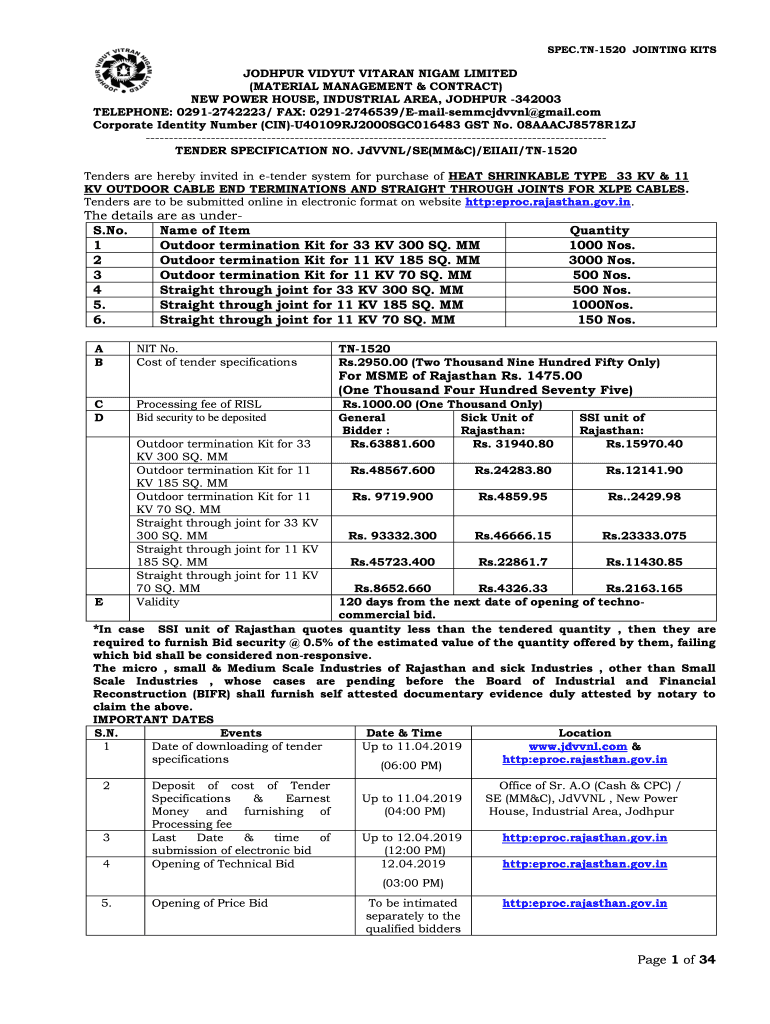 SPEC.TN1520 JOINTING KITSJODHPUR VILYUI VETERAN NI GAM LIMITED (MATERIAL MANAGEMENT & CONTRACT) NEW POWER HOUSE, INDUSTRIAL AREA, JODHPUR 342003 TELEPHONE: 02912742223/ FAX: 02912746539/Emailsemmcjdvvnl