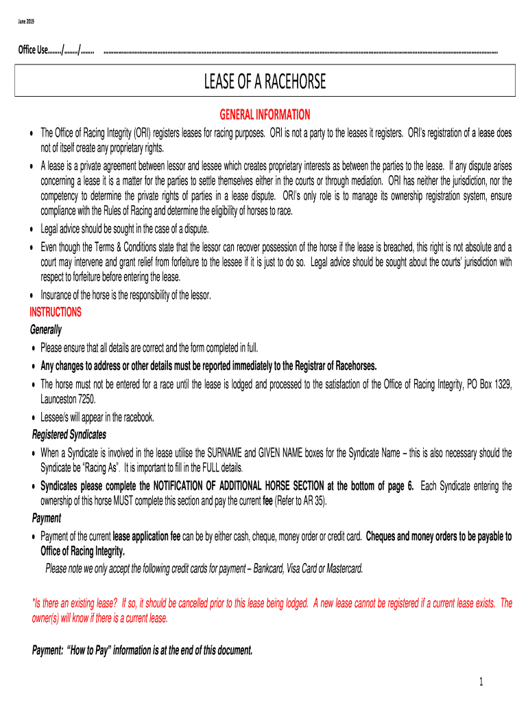 June 2019Office Use././...LEASE OF A RACEHORSE
