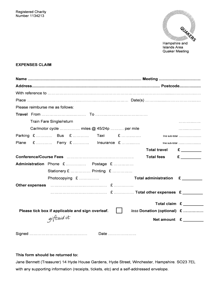 Registered Charity Number 1134213Hampshire and Islands Area Quaker MeetingEXPENSES Climate ..................................................................................................... Meeting