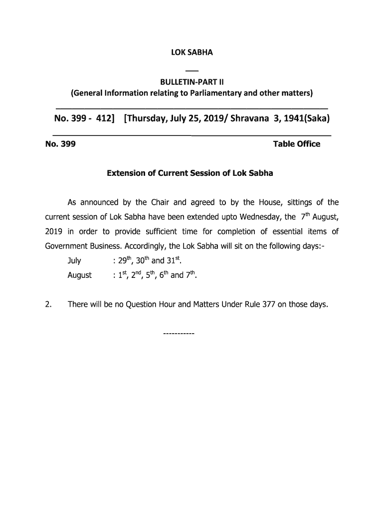OK SASHA BULLETINPART II (General Information relating to Parliamentary and other matters) No. 399 412 Thursday, July 25, 2019/ Havana 3, 1941(Aka) No. 399Table Office Extension of Current Session