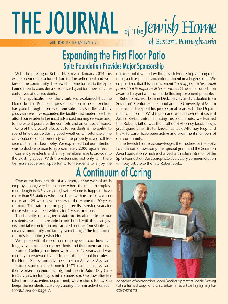 THE JOURNAL WINTER 2018 TEVET/SHEVAT 5778Jewish Home of The of Eastern PennsylvaniaExpanding the First Floor Patio Spitz Foundation Provides Major SponsorshipWith the passing of Robert H. Spitz in