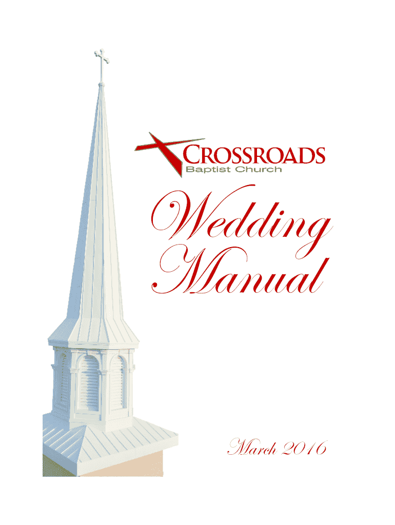 Wedding Manual March 2016Prices and policies effective for weddings scheduled after March 5, 2016.2Crossroads Baptist ChurchWedding Manual TABLE OF CONTENTS Letter to the Bride and Groom The Purpose