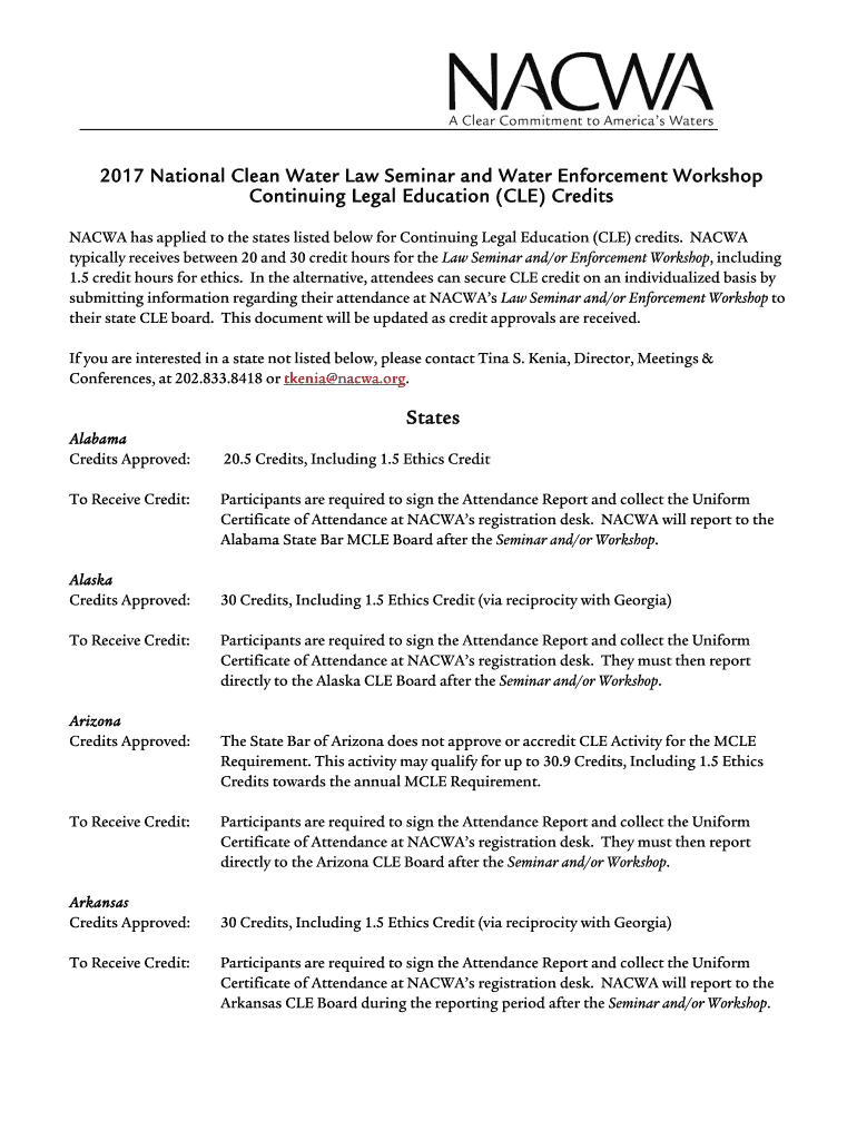 NACA has applied to the states listed below for Continuing Legal Education (CLE) credits.