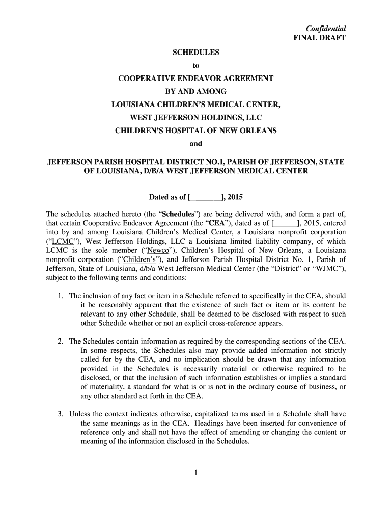 Confidential FINAL DRAFT SCHEDULES to COOPERATIVE ENDEAVOR AGREEMENT BY AND AMONG LOUISIANA CHILDREN MEDICAL CENTER, WEST JEFFERSON HOLDINGS, LLC CHILDREN HOSPITAL OF NEW ORLEANS and JEFFERSON PARISH