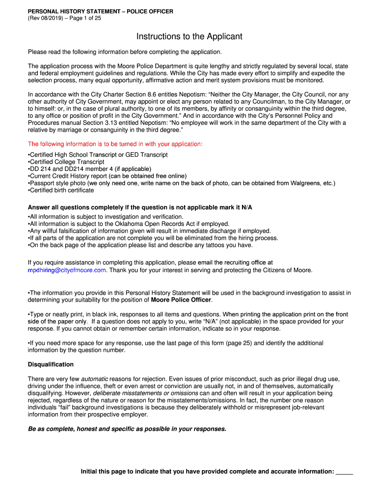 PERSONAL HISTORY STATEMENT POLICE OFFICER (Rev 08/2019) Page 1 of 25Instructions to the Applicant Please read the following information before completing the application. The application process with