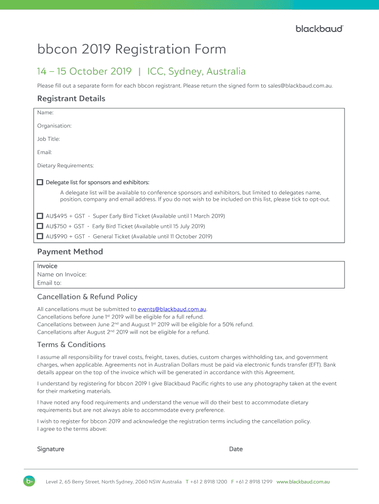 Bacon 2019 Registration Form 14 15 October 2019 ICC, Sydney, Australia Please fill out a separate form for each Bacon registrant. Please return the signed form to sales blackbaud.com.AU. Registrant