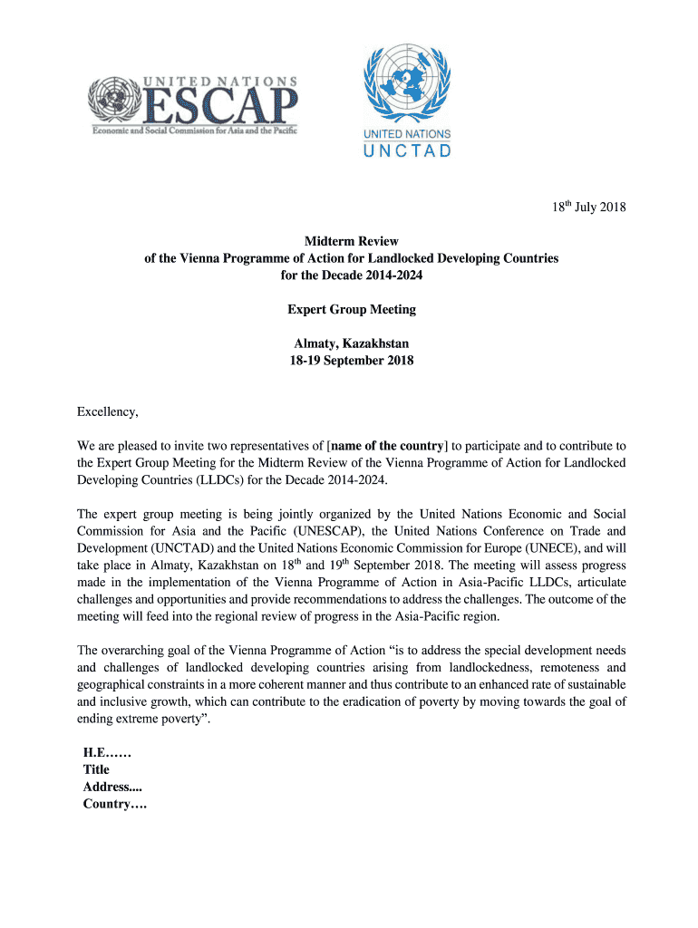 18th July 2018 Midterm Review of the Vienna Program of Action for Landlocked Developing Countries for the Decade 20142024 Expert Group Meeting Almaty, Kazakhstan 1819 September 2018Excellency, We