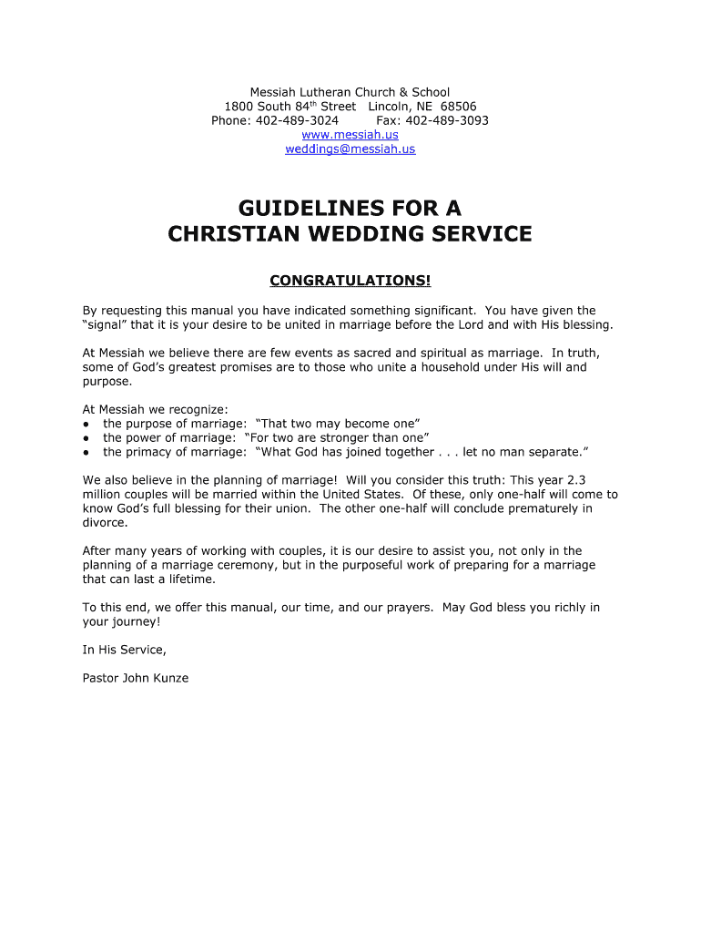 Messiah Lutheran Church & School 1800 South 84th Street Lincoln, NE 68506 Phone: 4024893024 Fax: 4024893093 www.messiah.us weddings messiah. Guidelines FOR A CHRISTIAN WEDDING SERVICE CONGRATULATIONS!