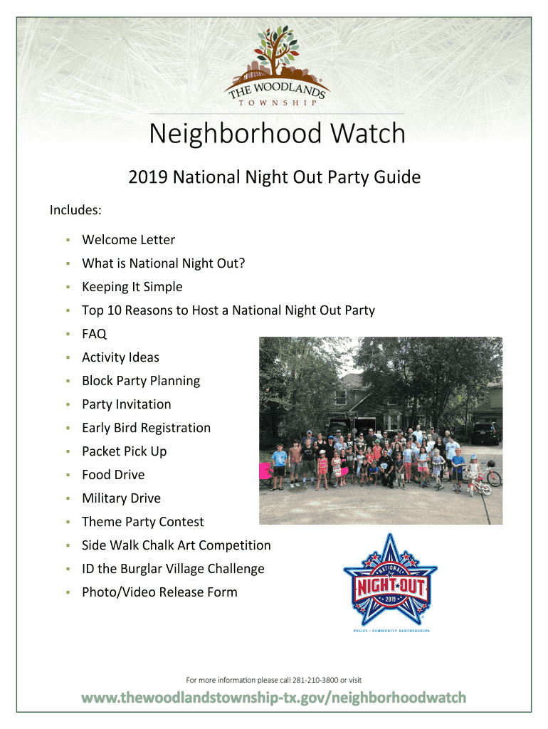 2019 National Night Out Party Guide Includes: Welcome Letter What is National Night Out? Keeping It Simple Top 10 Reasons to Host a National Night Out Party FAQ Activity Ideas Block Party Planning