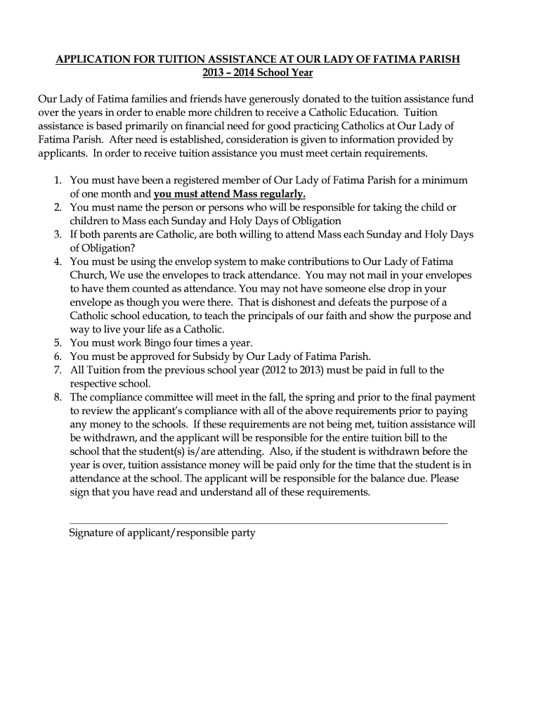 APPLICATION FOR TUITION ASSISTANCE AT OUR LADY OF FATIMA PARISH 2013 2014 School Year Our Lady of Fatima families and friends have generously donated to the tuition assistance fund over the years