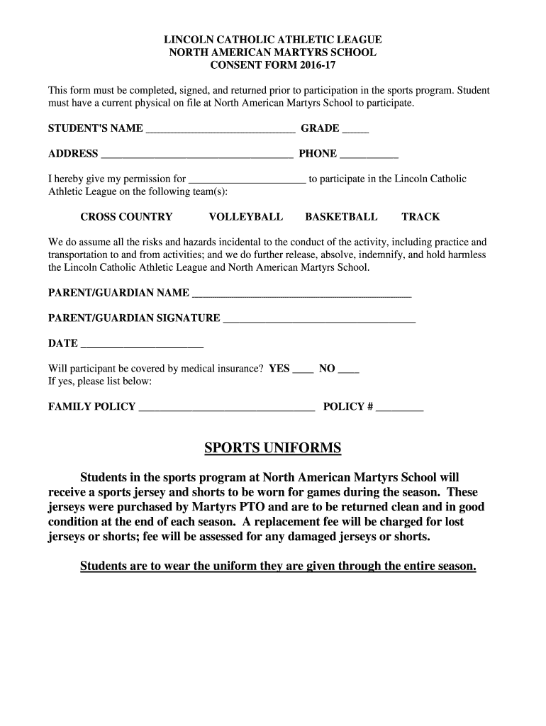 LINCOLN CATHOLIC ATHLETIC LEAGUE NORTH AMERICAN MARTYRS SCHOOL CONSENT FORM 201617 This form must be completed, signed, and returned prior to participation in the sports program. Student must have